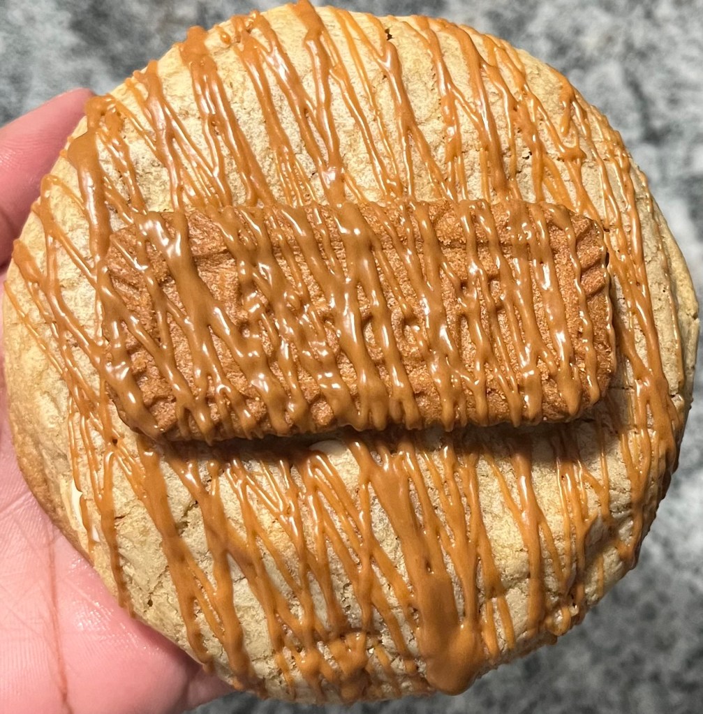 A thick, soft-baked cookie is packed with Biscoff cookie butter. It also includes creamy white chocolate. The cookie is finished with a luscious cookie butter drizzle. It is crowned with a crisp Biscoff biscuit. Rich, smooth, and indulgent in every bite.