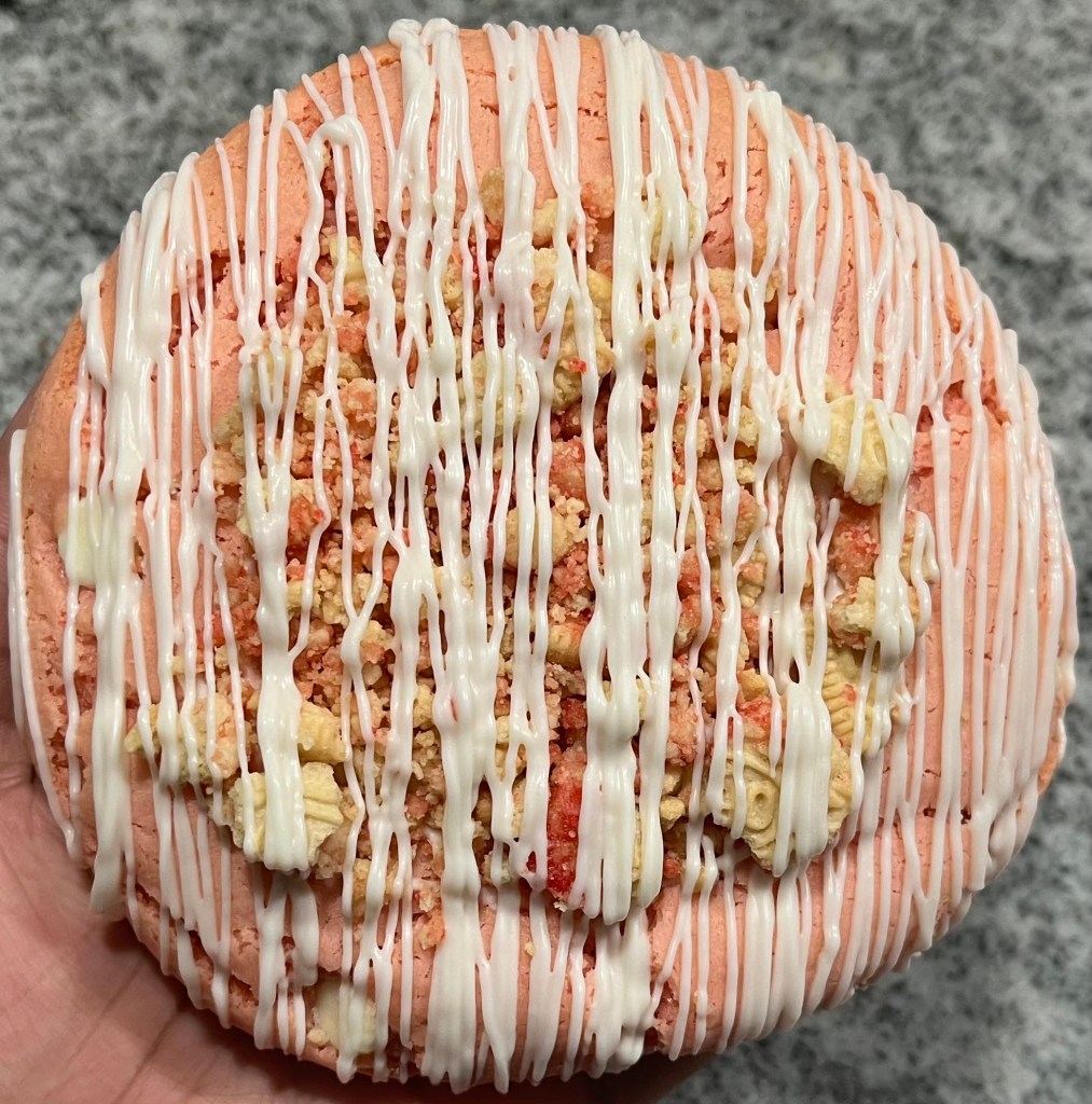 A soft, strawberry-flavored cookie topped with a buttery strawberry crunch and finished with a smooth white chocolate drizzle. Sweet, creamy, and perfectly balanced in every bite.