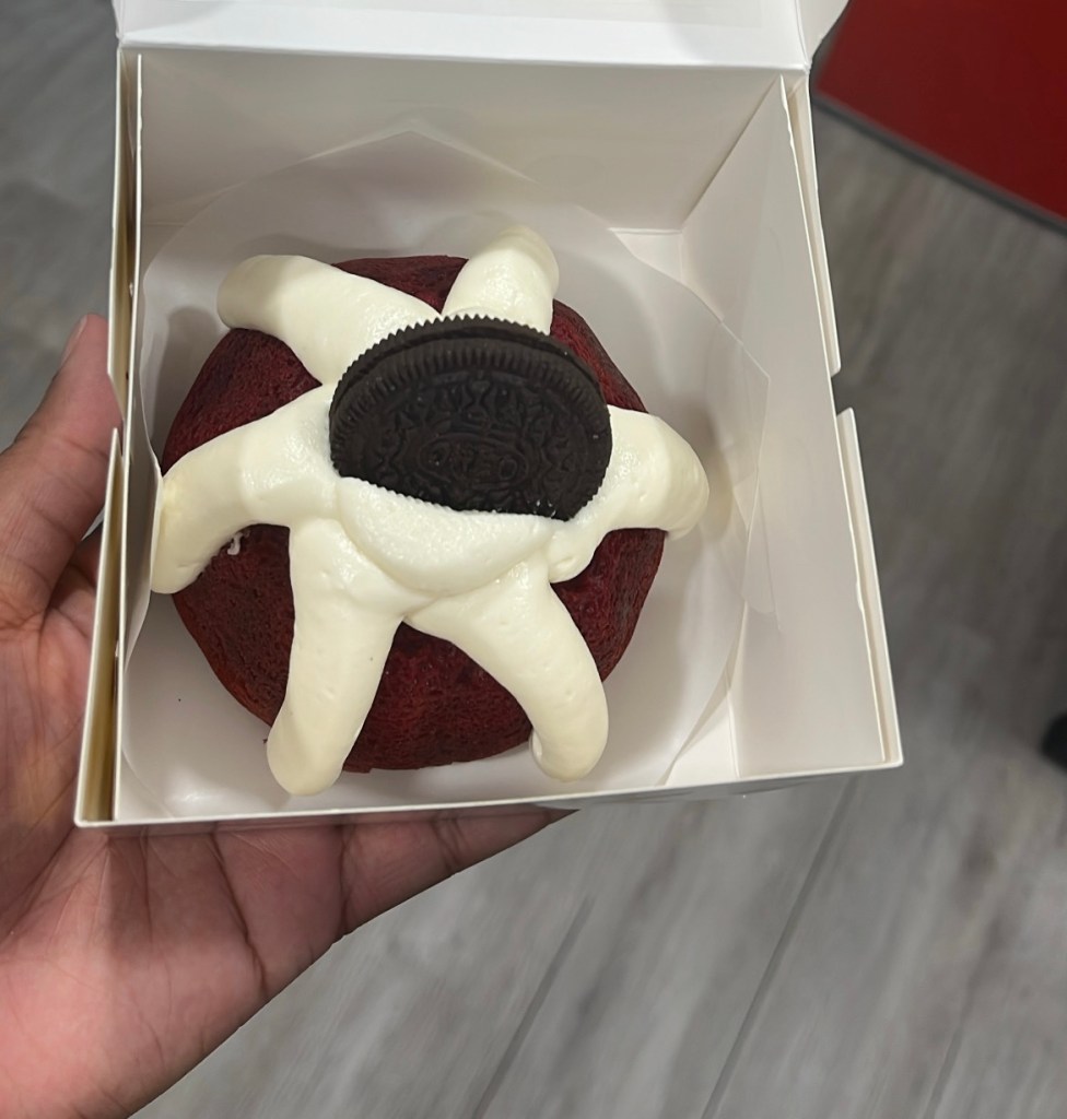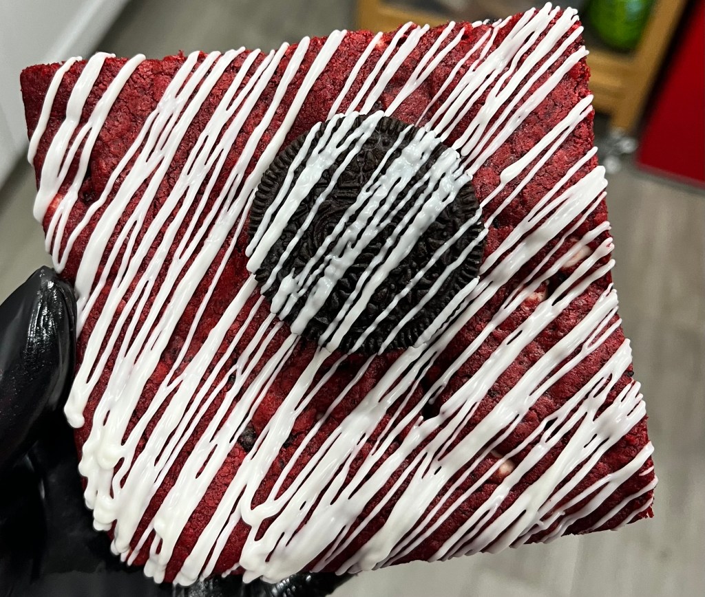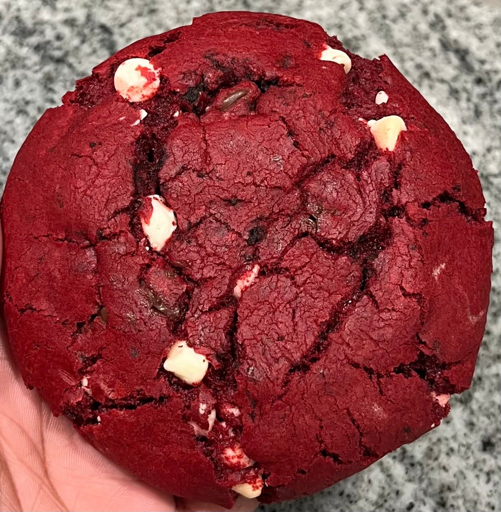 A thick red velvet cookie loaded with Oreo pieces, white chocolate, and rich chocolate chunks. Soft in the center with bold, decadent flavor in every bite.