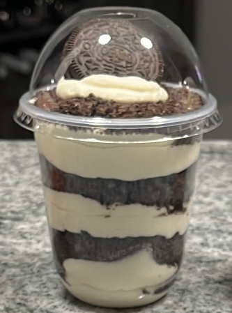 Velvet Crumble Cup– A rich red velvet cake cup is layered with smooth buttercream. It includes crushed chocolate sandwich cookies. It is finished with a creamy swirl on top. Soft, chocolaty, and perfectly balanced.