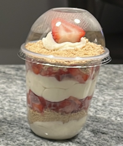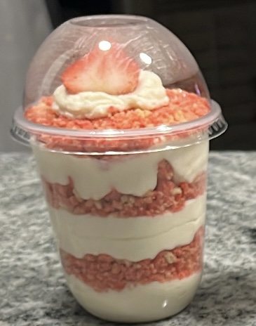 Berry Bliss Cup– A moist strawberry cake cup layered with buttercream and topped with our homemade strawberry crunch crumble. Sweet, fruity, and full of strawberry flavor.