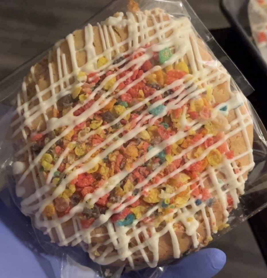 A soft bakery-style cookie topped with white chocolate drizzle and colorful cereal crunch for the perfect sweet and crispy bite.