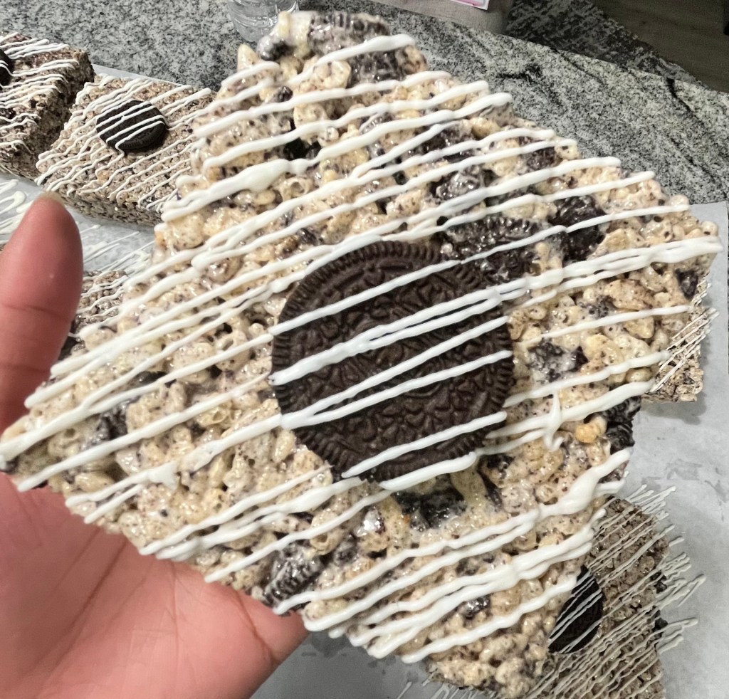 A thick, jumbo Rice Krispy treat made with gooey marshmallows and crushed chocolate sandwich cookies throughout. Finished with a full Oreo on top and drizzled with smooth white chocolate for a classic cookies-and-cream flavor. Soft, chewy, and perfectly balanced.