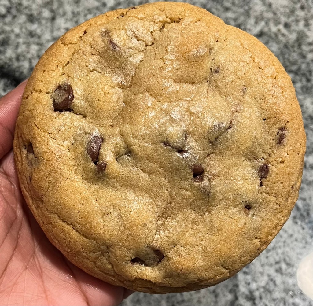 A thick, bakery-style chocolate chip cookie baked until golden with a soft, gooey center and rich chocolate in every bite.