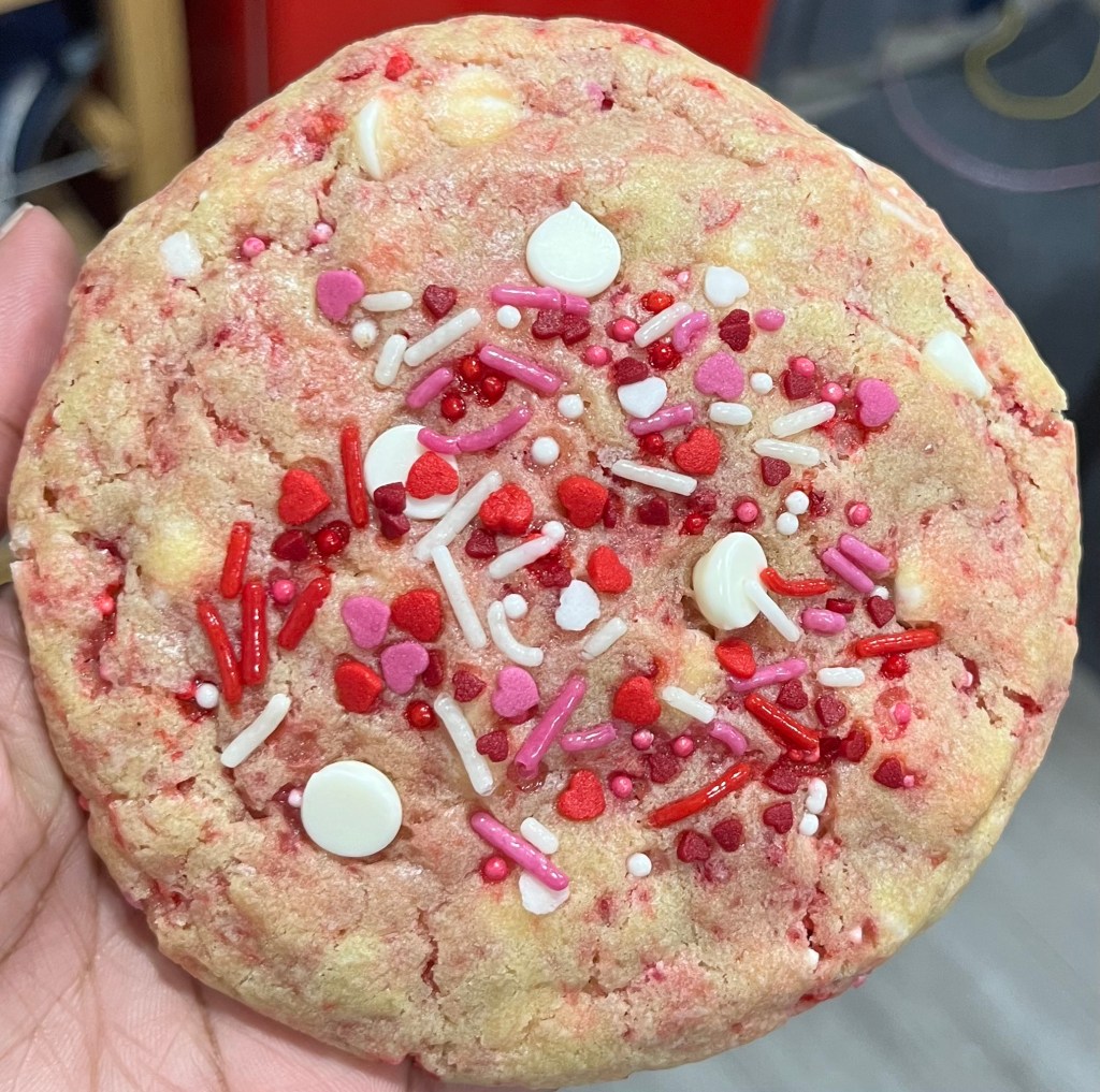 A soft sugar cookie loaded with creamy white chocolate chips and topped with festive heart sprinkles. Sweet, buttery, and baked fresh with a touch of Valentine sparkle.