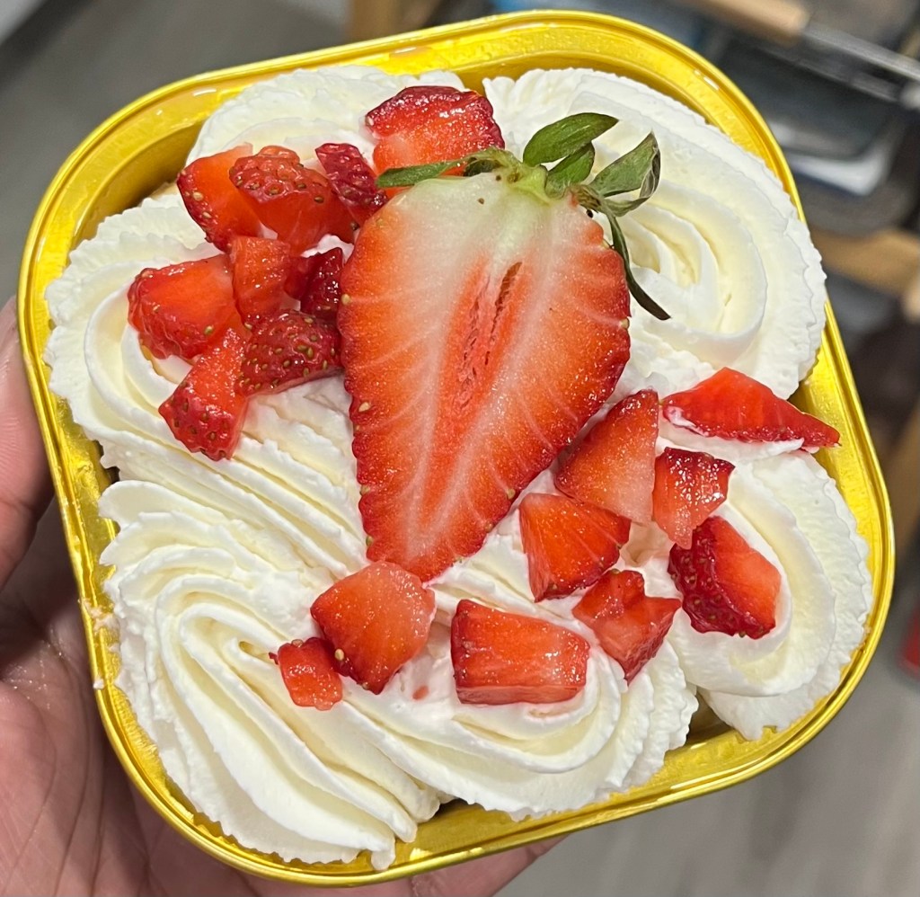 A soft vanilla milk cake topped with smooth whipped cream and fresh diced strawberries. Light, creamy, and perfectly sweet in every bite.