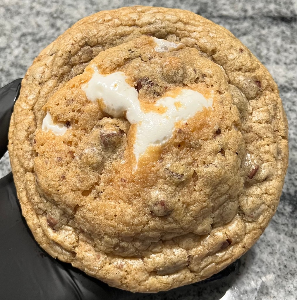 A thick, bakery-style chocolate chip cookie is loaded with gooey marshmallows and graham cracker pieces. It is baked soft and melts with a cozy campfire finish.